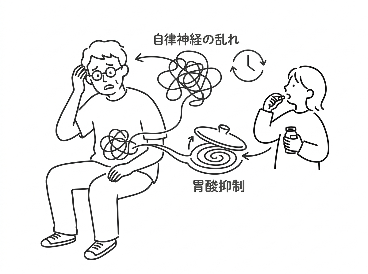 ところが、薬で胃酸を抑え続けると、この自然なリラックス信号が弱まります。結果として、交感神経(緊張モードの神経)が優位になりやすくなるのです。